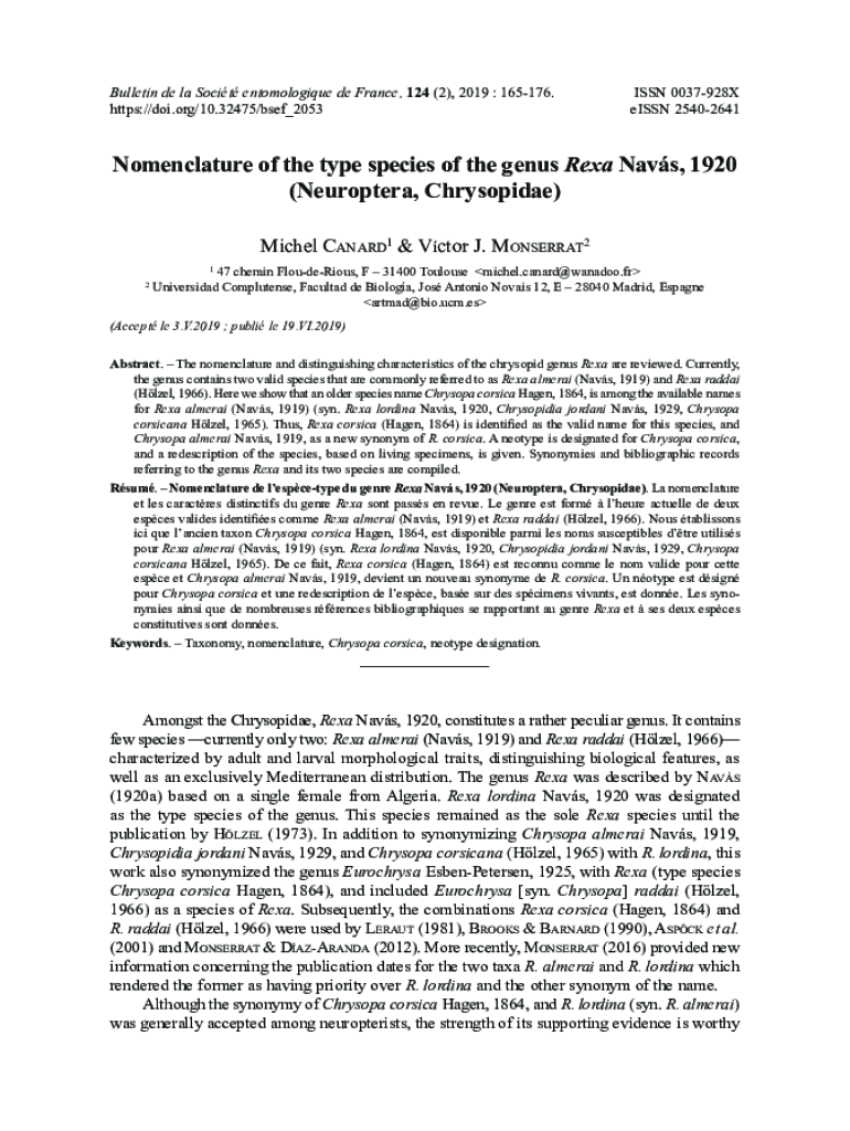 Bulletin de la So cit entomologist de France, 124 (2), 2019 : 165176.https://doi.org/10.32475/bsef_2053ISSN 0037928X ISSN 25402641Nomenclature of the type species of the genus Rex Navy, 1920 (Chiroptera,