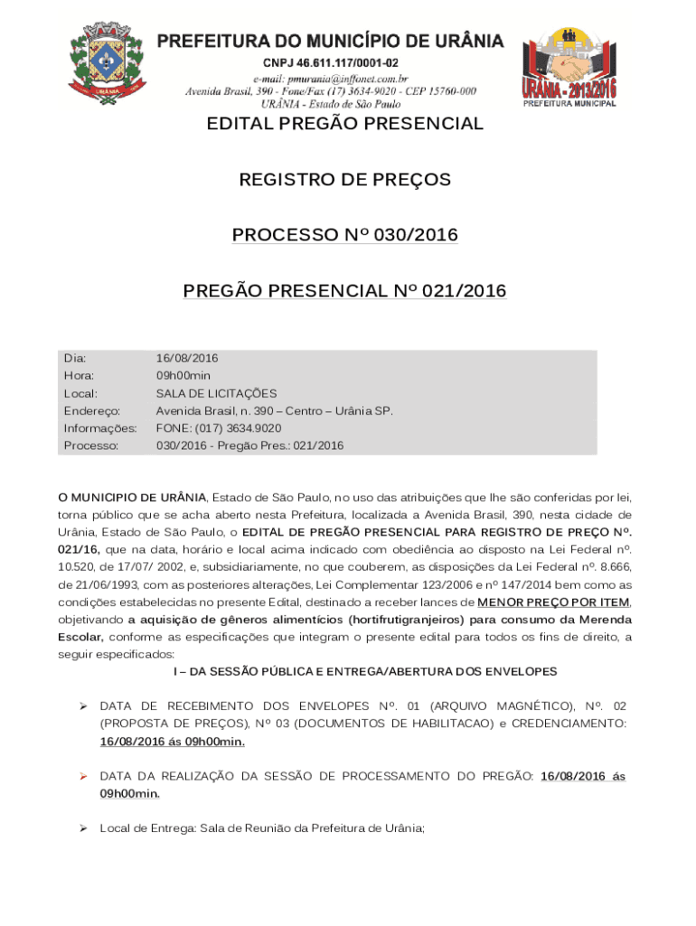 EDIT AL PRESO PRESENCE REGISTRY DE PRESS PROCESS N 030/2016 PRESO PRESENCE N 021/2016Dia:16/08/2016Hora:09h00minLocal:SALE DE LICITAESEndereo:Agenda Brazil, n. 390 CENTR Urania SP. Informed:ONE: (017)