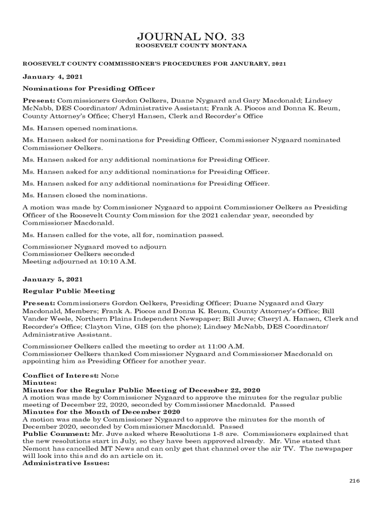 JOURNAL NO. 33ROOSEVELT COUNTY MONTANA ROOSEVELT COUNTY COMMISSIONERS PROCEDURES FOR JANUARY, 2021January 4, 2021 Nominations for Presiding Officer Present: Commissioners Gordon Elders, Duane Niggard