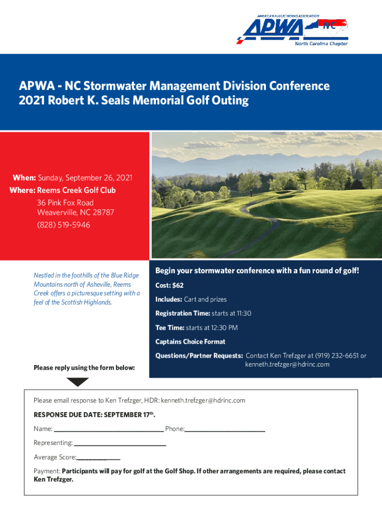 APA NC Stormwater Management Division Conference 2021 Robert K. Seals Memorial Golf OutingWhen: Sunday, September 26, 2021, Where: Seems Creek Golf Club 36 Pink Fox Road Waterville, NC 28787 (828)