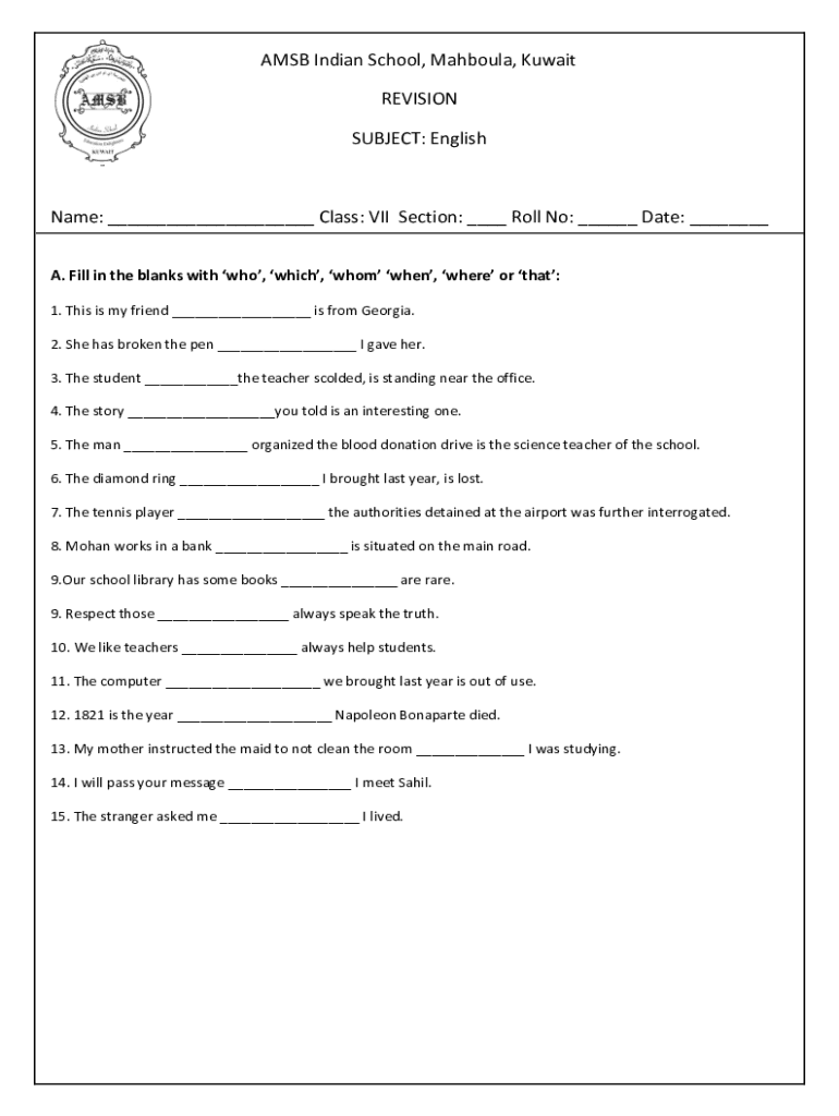 SUBJECT: Englishman: ___ Class: VII Section: ___ Roll No: ___ Date: ___