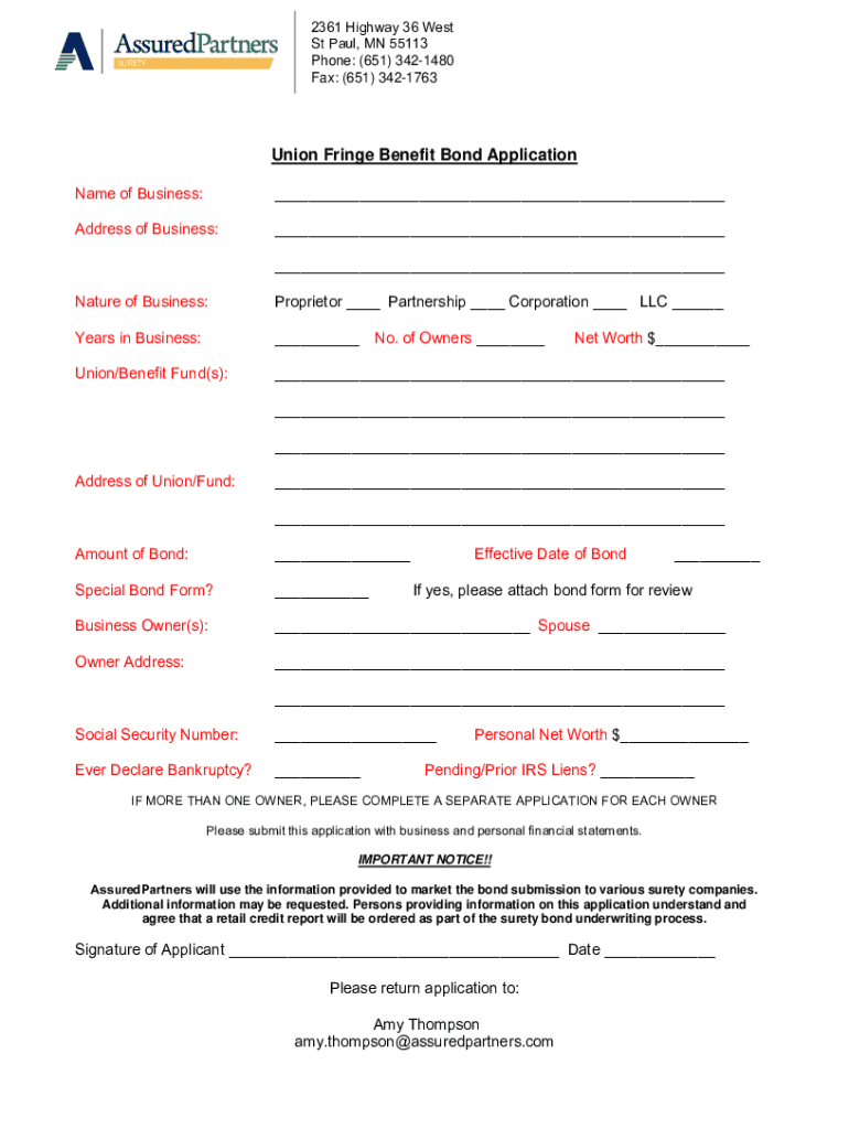 Get the free Union Fringe Benefit Bond Application - Assured Partners