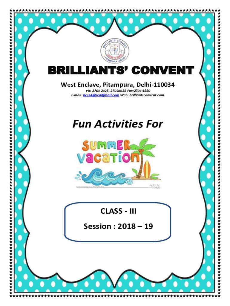 West Enclave, Tempura, Delhi110034 pH: 2703 2325, 27028625 Fax:2703 4550 Email: bcs34@rediffmail.com Web: brilliants convent. Common Activities Formless III Session : 2018 19THIS IS THE TIME I WAS