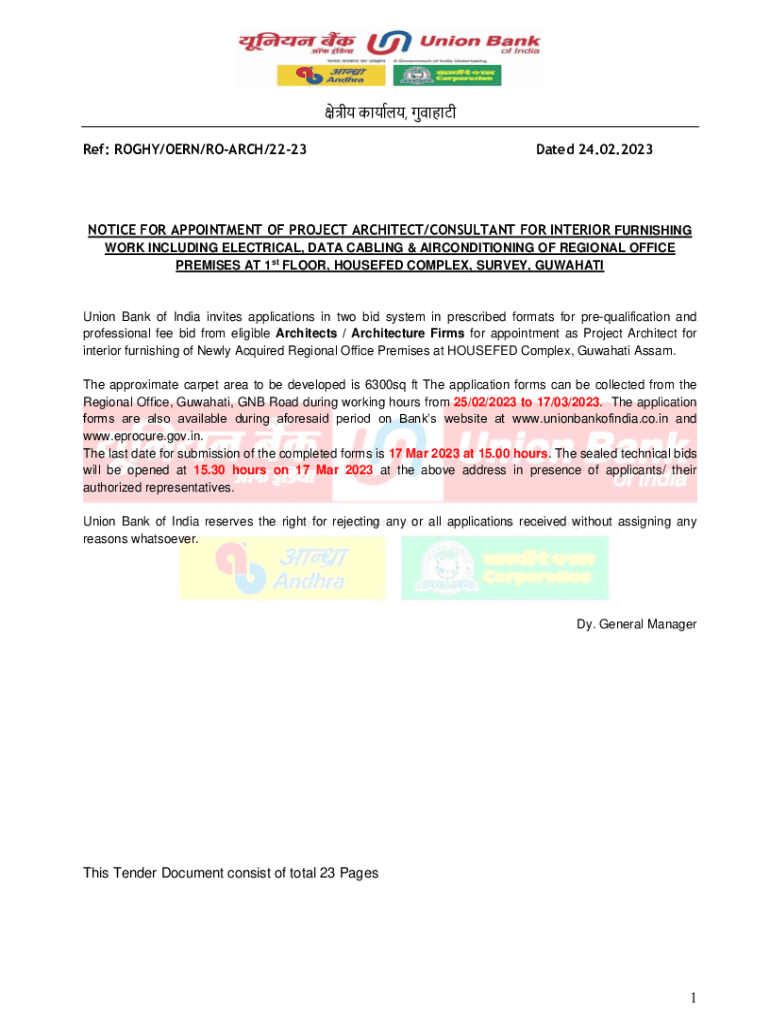 , Ref: RIGHT/BERN/ROACH/2223Dated 24.02.2023NOTICE FOR APPOINTMENT OF PROJECT ARCHITECT/CONSULTANT FOR INTERIOR FURNISHING WORK INCLUDING ELECTRICAL, DATA CABLING & AIR-CONDITIONING OF REGIONAL OFFICE