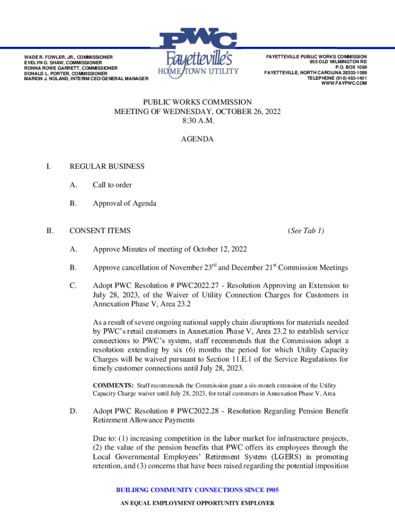 FAYETTEVILLE PUBLIC WORKS COMMISSION 955 OLD WILMINGTON RD P.O. BOX 1089 FAYETTEVILLE, NORTH CAROLINA 283021089 TELEPHONE (910) 4831401 WWW.FABRIC.COMRADE R. FOWLER, JR., COMMISSIONER EVELYN O. SHAW,