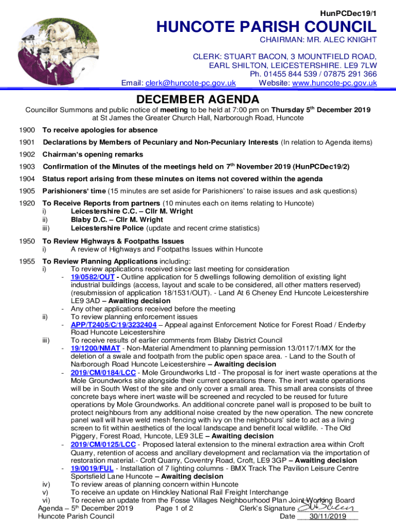 HunPCDec19/1HUNCOTE PARISH COUNCIL CHAIRMAN: MR. ALEC KNIGHT CLERK: STUART BACON, 3 OUTFIELD ROAD, EARL HILTON, LEICESTERSHIRE. LE9 7LW pH. 01455 844 539 / 07875 291 366 Email: clerk@huncotepc.gov.uk