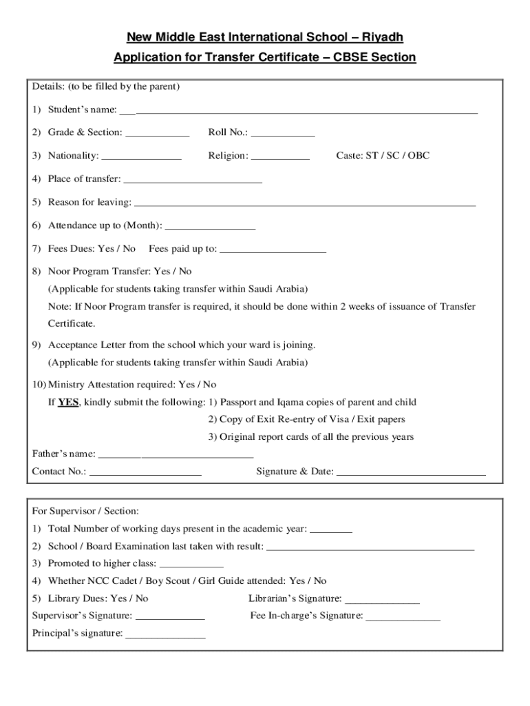 New Middle East International School Riyadh Application for Transfer Certificate CBSE Section Details: (to be filled by the parent) 1) Students name: ___ 2) Grade & Section: ___Roll No.: ___3) Nationality: