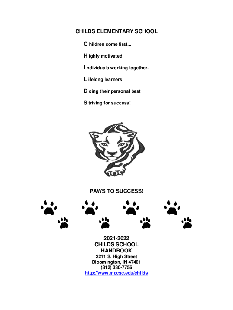 CHILD ELEMENTARY SCHOOL Children come first... Highly motivated I individuals working together. Lifelong learners Doing their personal the best St riving for success!PAWS TO SUCCESS!20212022 CHILD