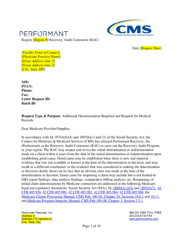 Region [Region #] Recovery Audit Contractor (RAC) Date [Request Date] [Facility Point of Contact] [Physician Practice Name] [Street Address Line 1] [Street Address Line 2] [City, State ZIP]NPI: PLAN: