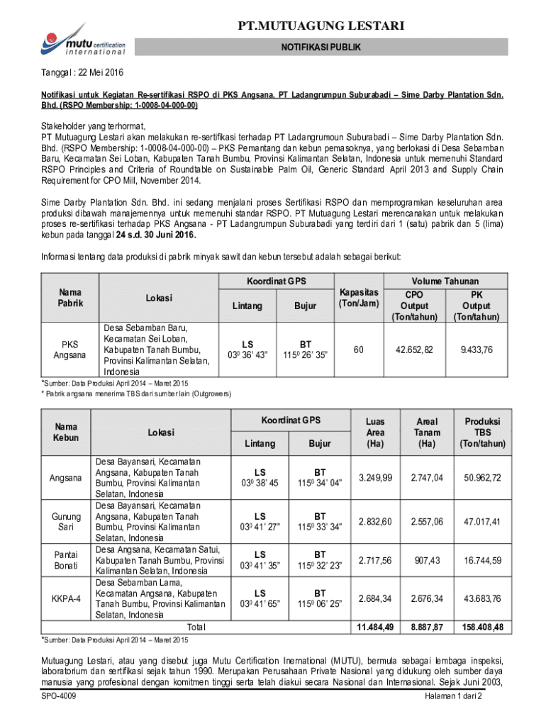 Notifies untuck Keaton Resertifikasi RPO di PKS Angina, PT Ladangrumpun Suburban Some Darby Plantation SDN.