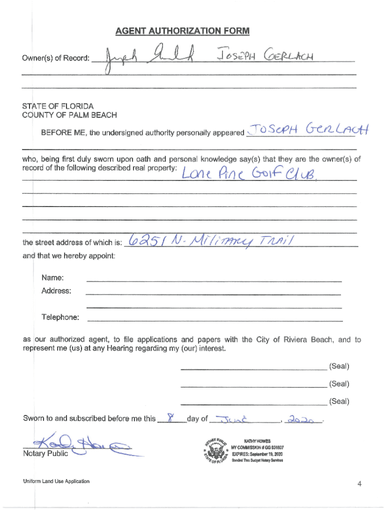 AGENT AUTHORIZATION FORM...___ FJ n A TtsPt1 .... 1Owner(s) of Record: __ v ___STATE OF FLORIDA COUNTY OF PALM BEACH BEFORE ME, the undersigned authority personally appeared10SH6efl... Kathy, being