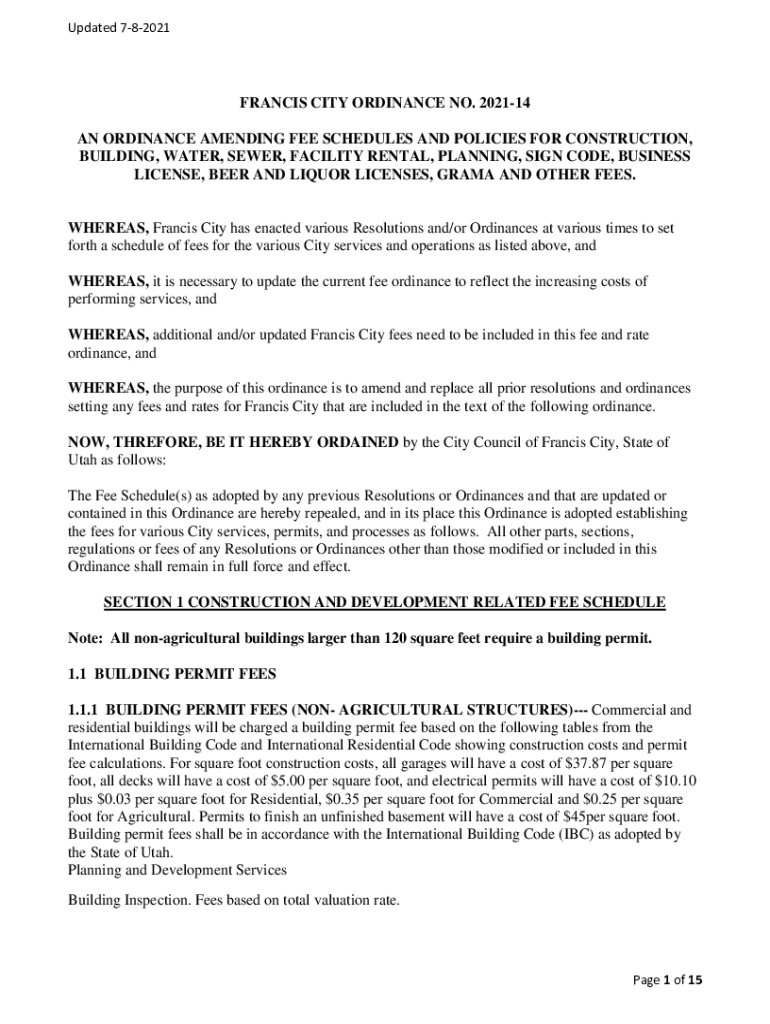 Updated 782021FRANCIS CITY ORDINANCE NO. 202114 AN ORDINANCE AMENDING FEE SCHEDULES AND POLICIES FOR CONSTRUCTION, BUILDING, WATER, SEWER, FACILITY RENTAL, PLANNING, SIGN CODE, BUSINESS LICENSE, BEER