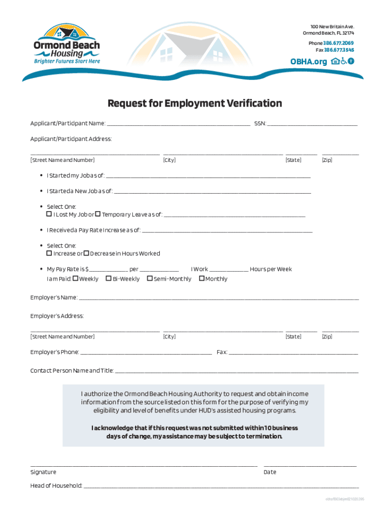 100 New Britain Ave. Ormond Beach, FL 32174 Phone 386.677.2069 Fax 386.677.3545OBHA.request for Employment Verification Applicant/Participant Name: ___ SSN: ___ Applicant/Participant Address: ___