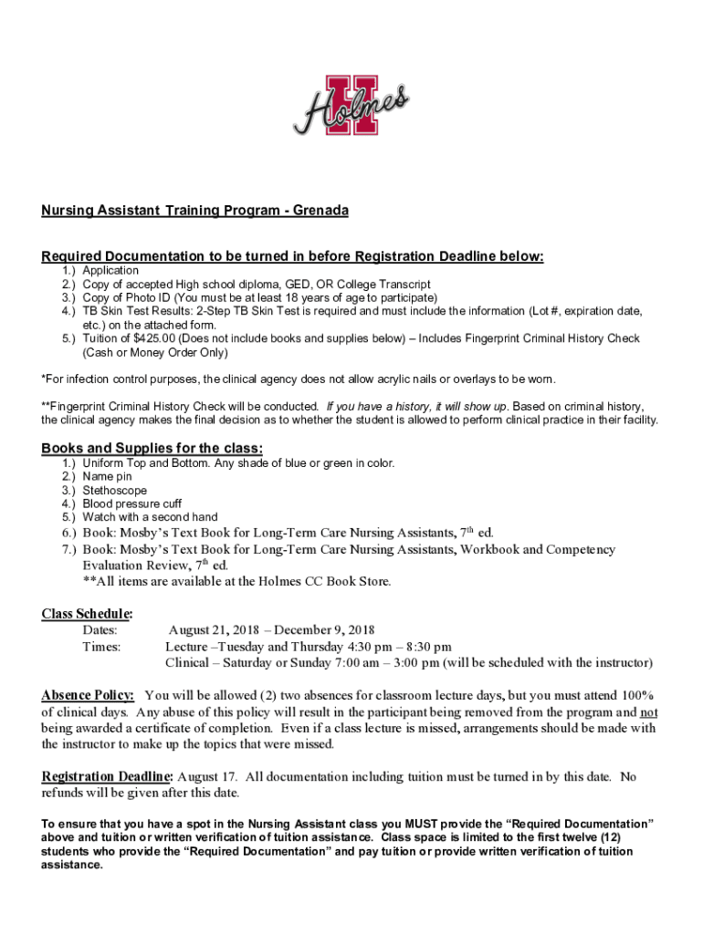 Nursing Assistant Training Program Grenada Required Documentation to be turned in before Registration Deadline below: 1.) 2.) 3.) 4.) Application Copy of accepted High school diploma, GED, OR College