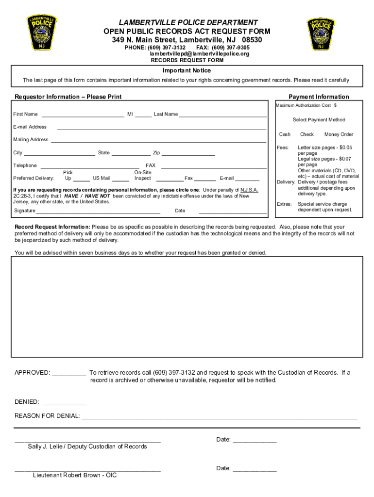 Get the free Lambertville Police Department Open Public Records Act Request ...