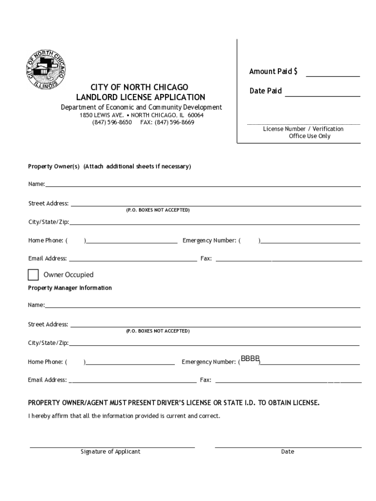 Amount Paid $CITY OF NORTH CHICAGO LANDLORD LICENSE APPLICATIONDate PaidDepartment of Economic and Community Development 1850 LEWIS AVE. NORTH CHICAGO, IL 60064 (847) 5968650 FAX: (847) 5968669___