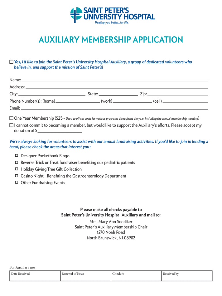 AUXILIARY MEMBERSHIP APPLICATION Yes, I'd like to join the Saint Peters University Hospital Auxiliary, a group of dedicated volunteers who believe in, and support the mission of Saint Peters! Name: