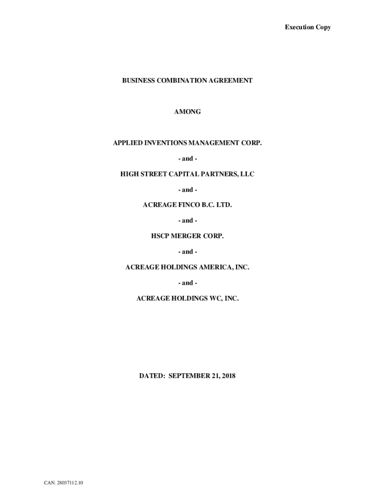Execution Copiousness COMBINATION AGREEMENTAMONGAPPLIED INVENTIONS MANAGEMENT CORP. And HIGH STREET CAPITAL PARTNERS, LLC and ACREAGE FINCH B.C. LTD. And HSP MERGER CORP. And ACREAGE HOLDINGS AMERICA,
