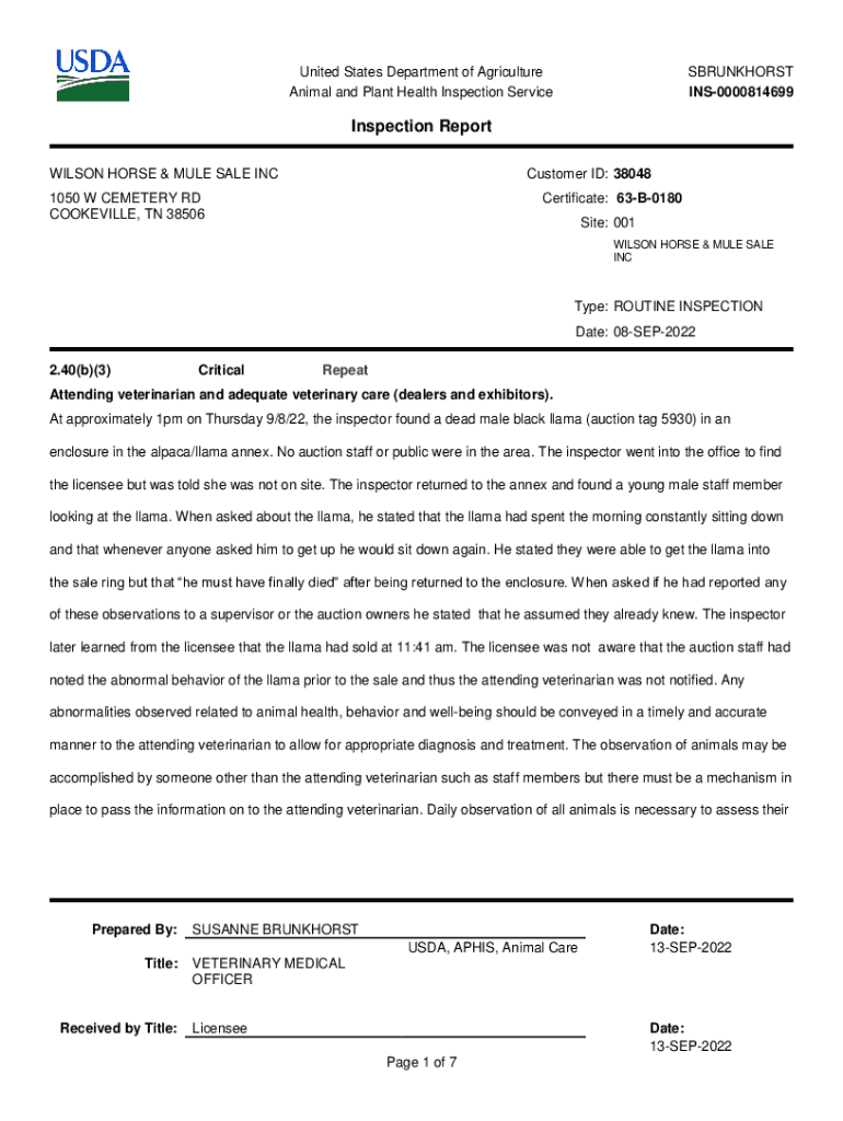 United States Department of Agriculture Animal and Plant Health Inspection ServiceSBRUNKHORST INS0000814699Inspection Report Customer ID: 38048WILSON HORSE & MULE SALE Certificate: 63B01801050 W CEMETERY