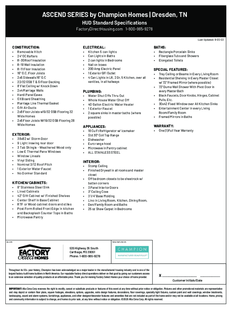 ASCEND SERIES by Champion Homes | Dresden, TN HUD Standard SpecificationsFactoryDirectHousing.com 18009659278 Last Updated: 92022CONSTRUCTION: Removable Hitch 24 OC Rafters R30 Roof Insulation R19
