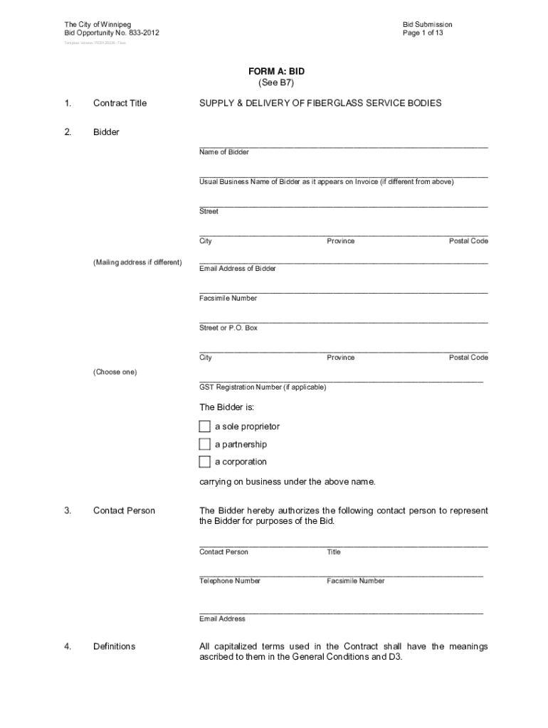 The City of Winnipeg Bid Opportunity No. 8332012Bid Submission Page 1 of 13Template Version: F020120228 Platform A: BID (See B7) 1. Contract Title2. Undersupply & DELIVERY OF FIBERGLASS SERVICE BODIES___