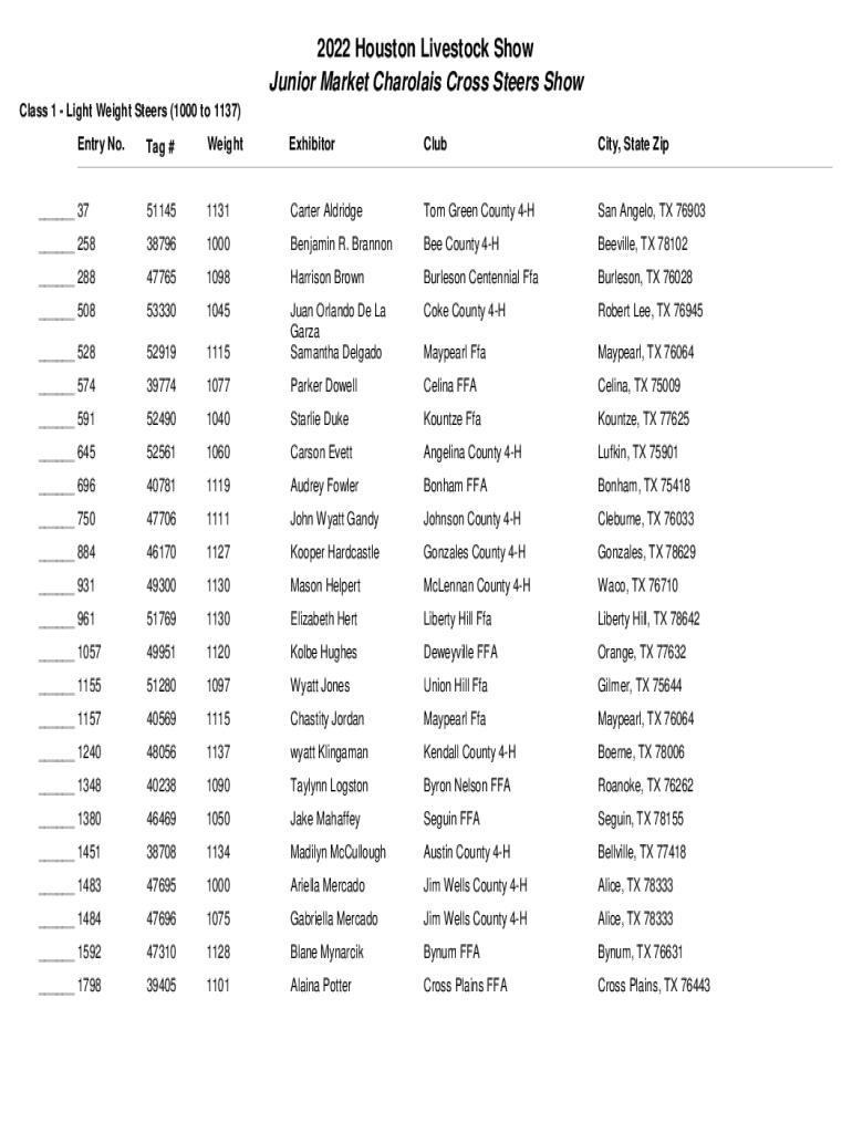 Entry No. Tag #WeightExhibitorClubCity, State Zip___ 37511451131Carter Aldridge Green