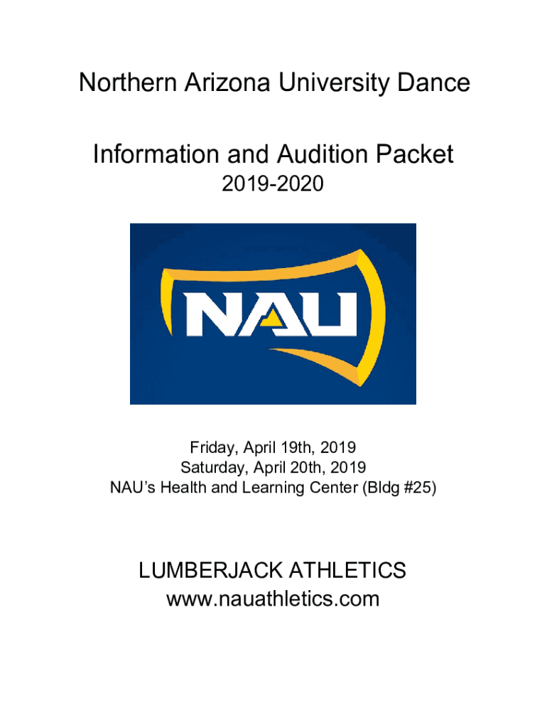 Northern Arizona University Dance Information and Audition Packet 20192020Friday, April 19th, 2019 Saturday, April 20th, 2019 Nous Health and Learning Center (Bldg #25)LUMBERJACK ATHLETICS www.nauathletics.comNORTHERN