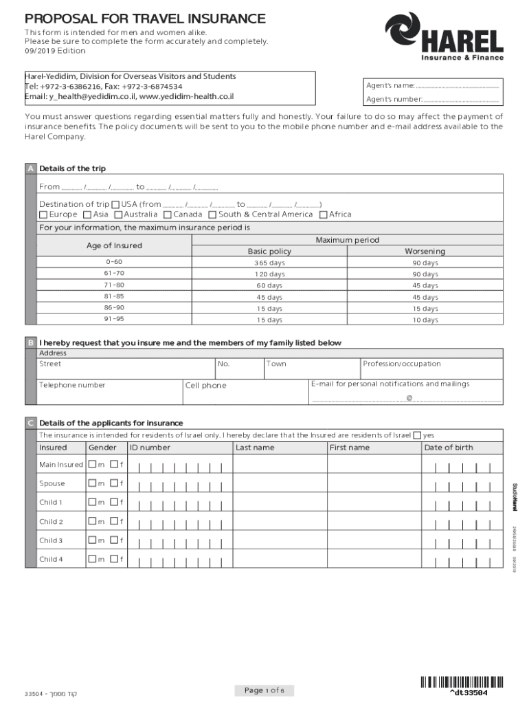 PROPOSAL FOR TRAVEL Insurances form is intended for men and women alike. Please be sure to complete the form accurately and completely. 09/2019 Edition HarelYedidim, Division for Overseas Visitors