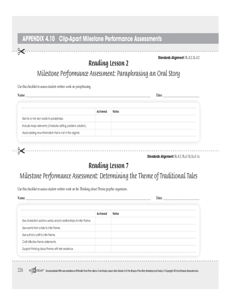 Appendix 4.10 Clipper Milestone Performance AssessmentsStandards Alignment: RL.4.2, SL.4.2Reading Lesson 2 Milestone Performance Assessment: Paraphrasing an Oral Story Use this checklist to assess