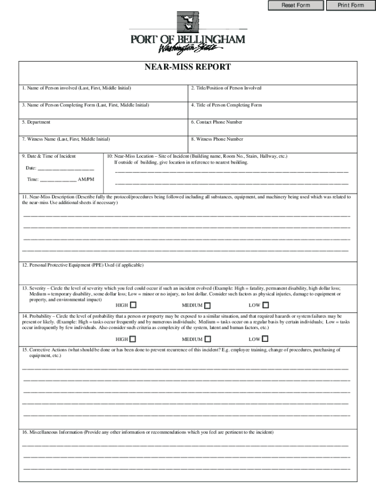 Near-miss form - port is a report that documents incidents or events which could have resulted in an accident or injury but did not.