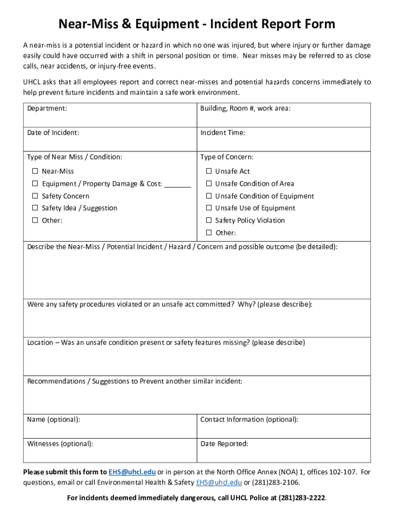 NearMiss&EquipmentIncidentReportForm Anearmissisapotentialincidentorhazardinwhichnoonewasinjured, butwhereinjuryorfurtherdamage easilycouldhaveoccurredwithashiftinpersonalpositionortime. Nearmissesmaybereferredtoasclose