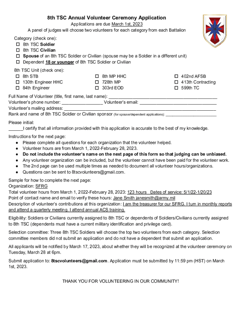 8th TSC Annual Volunteer Ceremony ApplicationApplications are due March 1st, 2023 A panel of judges will choose two volunteers for each category from each Battalion Category (check one): 8th TSC Soldier
