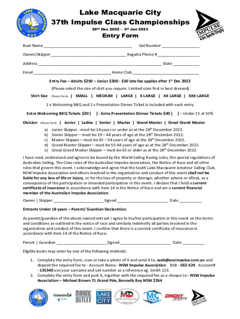 Lake Macquarie City 37th Impulse Class Championships 28th Dec 2022 3rd Jan 2023Entry Form Boat Name ___Sail Number ___Owner/Skipper ___ Regatta Phone # ___ Address ___ State ___ Email ___ Home Club