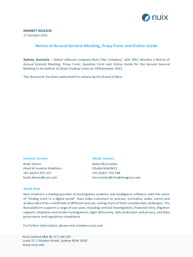 MARKET RELEASE 17 October 2022Notice of Annual General Meeting, Proxy Form and Online Guide Sydney, Australia Global software company New (the Company, ASX: NFL) attaches a Notice of Annual General