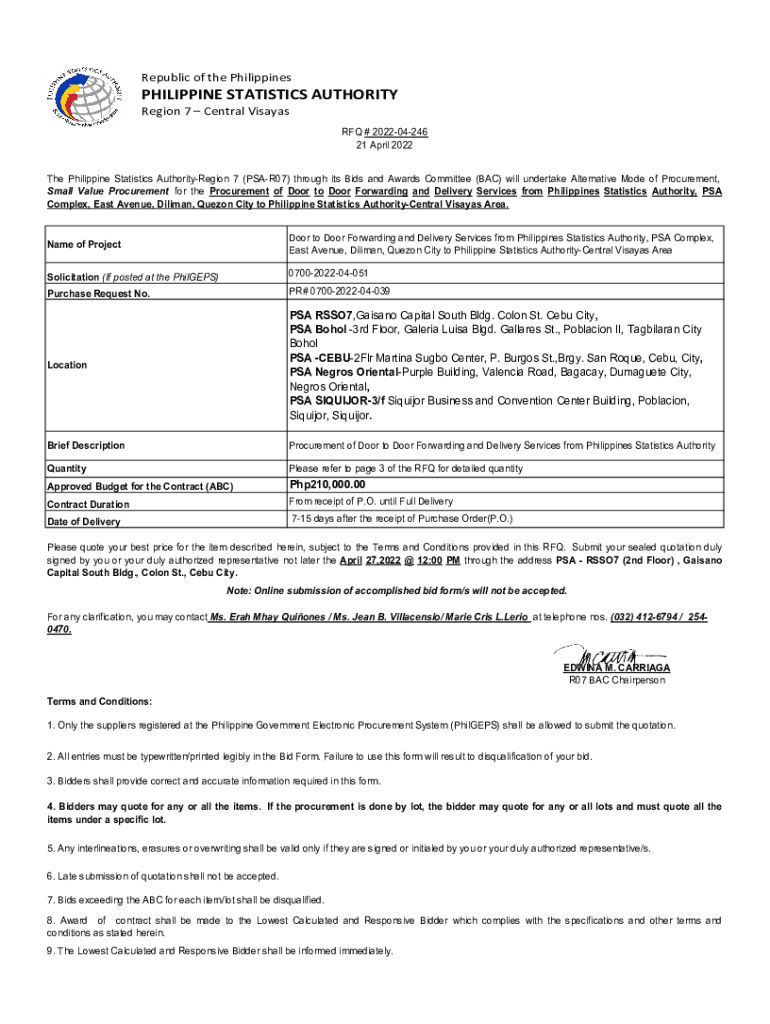 Republic of the PhilippinesPHILIPPINE STATISTICS AUTHORITY Region 7 Central VisayasREQUEST FOR QUOTATION RFQ # 202204246 21 April 2022The Philippine Statistics AuthorityRegion 7 (PSAR07) through its