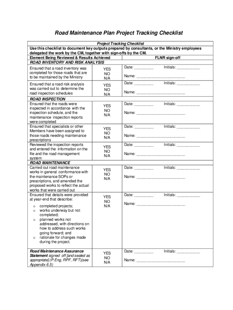 Road Maintenance Plan Project Tracking Checklist Project Tracking Checklist Use this checklist to document key outputs prepared by consultants, or the Ministry employees delegated the work by the
