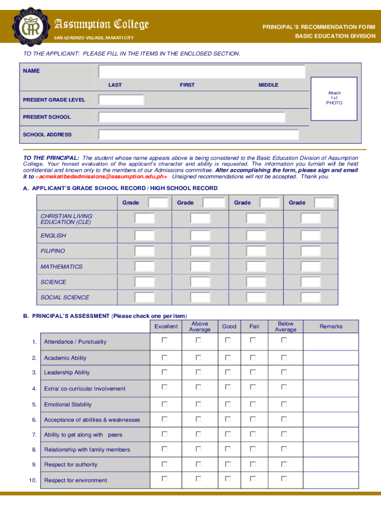 Get the free Principal's Recommendation Form - Assumption College