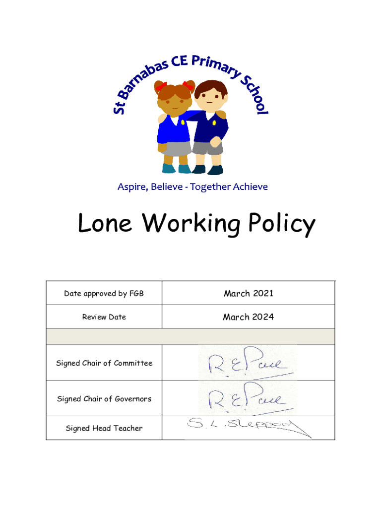 Lone Working Policy Date approved by March 2021Review Date March 2024Signed Chair of CommitteeSigned Chair of GovernorsSigned Head Teacher1 Statement The school aims to ensure, as far as is reasonably