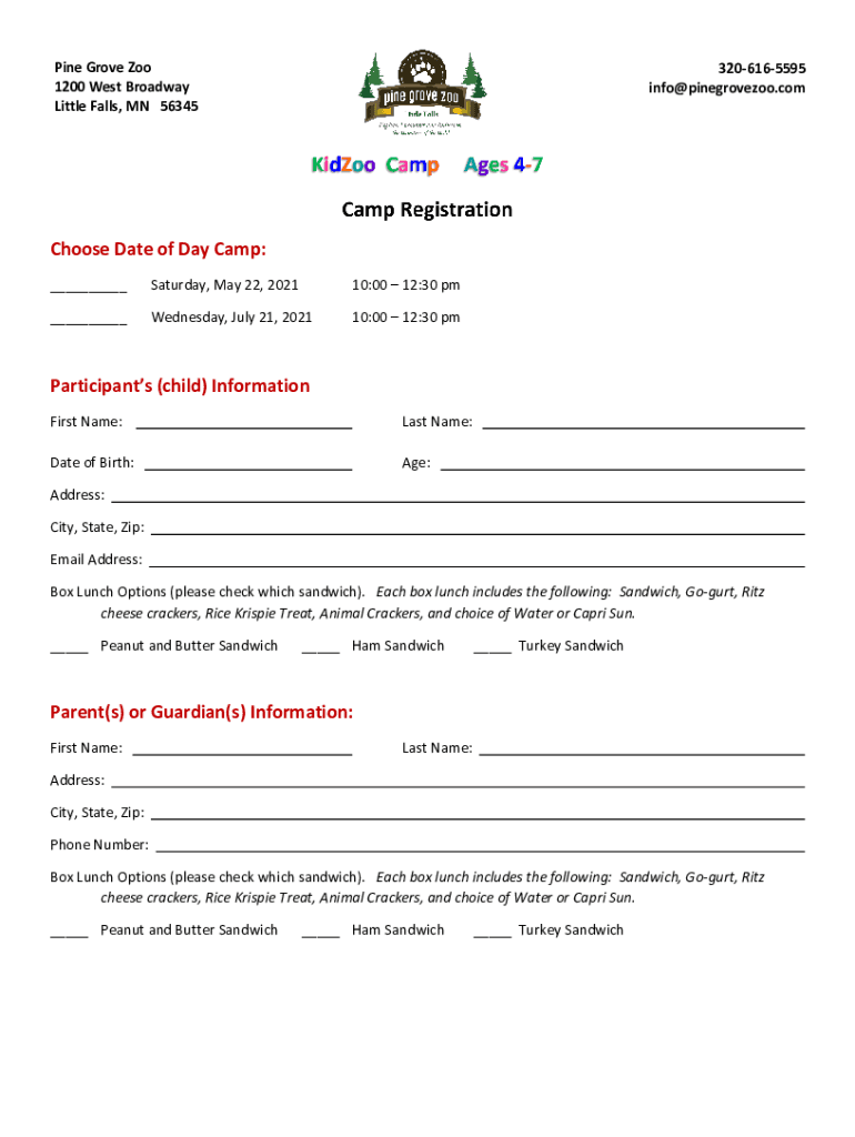 Pine Grove Zoo 1200 West Broadway Little Falls, MN 563453206165595 info@pinegrovezoo.comChoose Date of Day Camp: ___Saturday, May 22, 202110:00 12:30 pm___Wednesday, July 21, 202110:00 12:30 participants