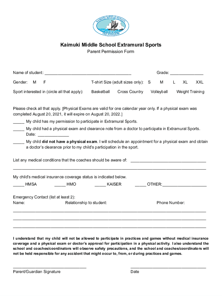 KaimukiMiddleSchoolExtramuralSports ParentPermissionForm Nameofstudent:___ Gender:Grade:___ TshirtSize(adultsizesonly): SSportinterestedin(circleallthatapply): BasketballCrossCountryMVolleyballLXLXXL