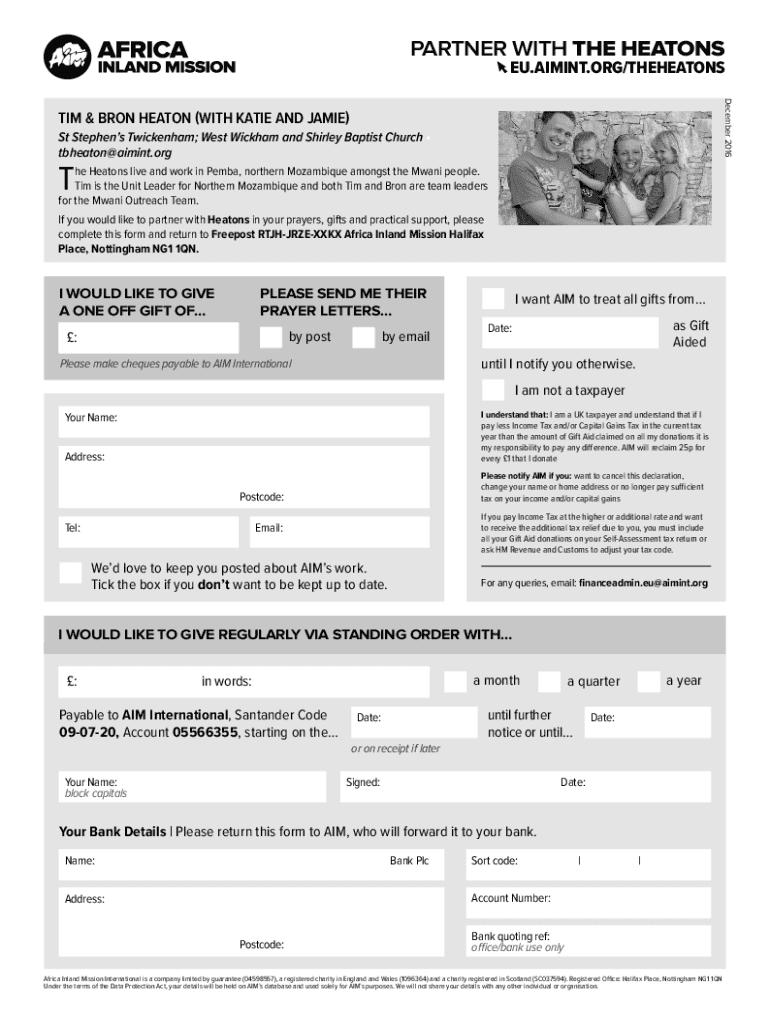 PARTNER WITH THE HEATONSEU.AIMINT.ORG/THEHEATONS heatonsDecember 2016TIM & BROWN EATON (WITH KATIE AND JAMIE) St Stephens Wickersham; West Wickham and Shirley Baptist Church tbheaton@aimint.orgThe