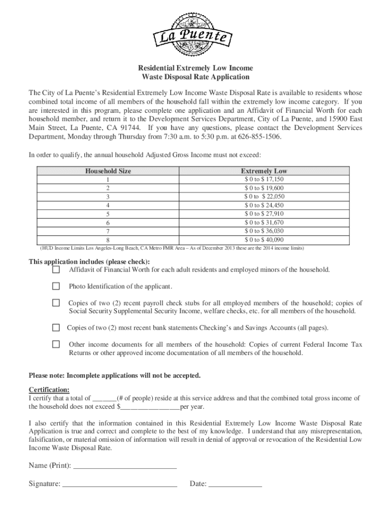 Residential Extremely Low Income Waste Disposal Rate Application The City of La Fuentes Residential Extremely Low Income Waste Disposal Rate is available to residents whose combined total income of