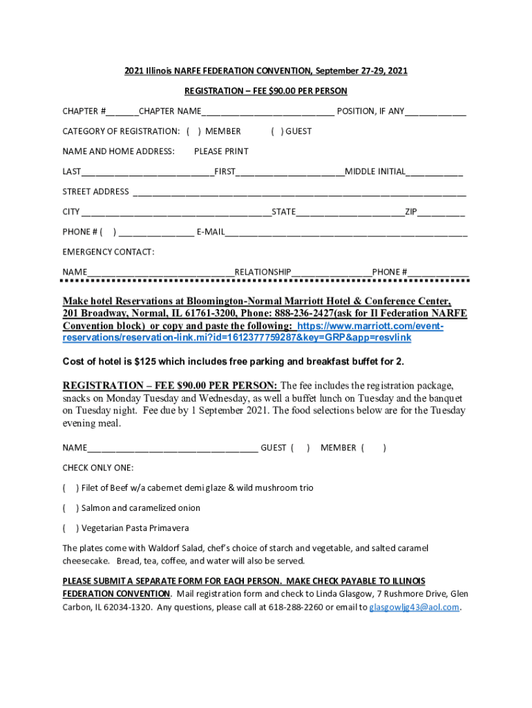 2021 Illinois ARE FEDERATION CONVENTION, September 2729, 2021 REGISTRATION FEE $90.00 PER PERSON CHAPTER #___CHAPTER NAME___ POSITION, IF ANY___ CATEGORY OF REGISTRATION: () MEMBER NAME AND HOME ADDRESS:()