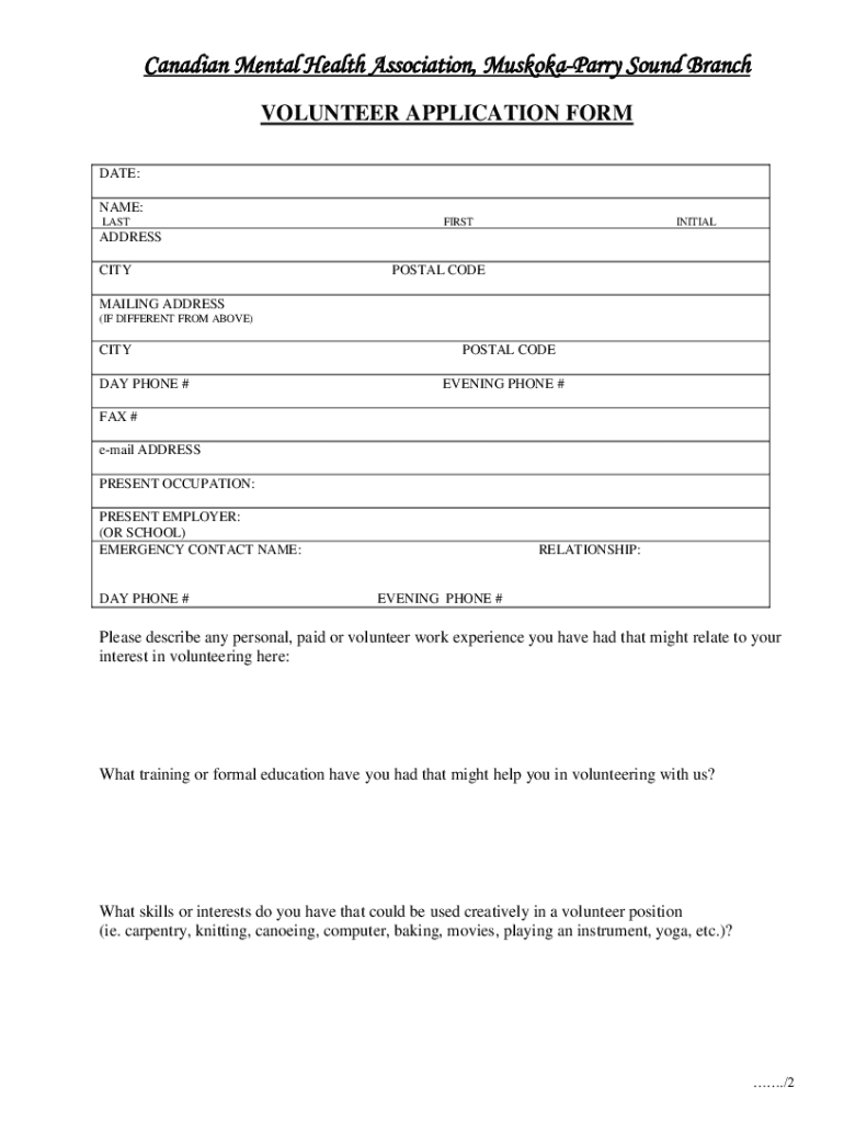 Get the free Volunteer Application Form - CMHA Muskoka-Parry Sound - mps cmha