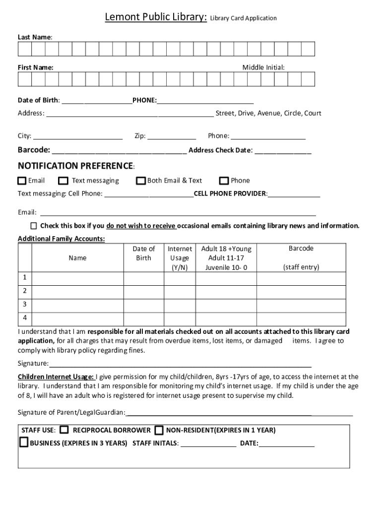 Lemont Public Library: Library Card Application Last Name:First Name:Middle Initial:Date of Birth: ___PHONE:___ Address: ___ Street, Drive, Avenue, Circle, Court City: ___Zip: ___Phone: ___Barcode: