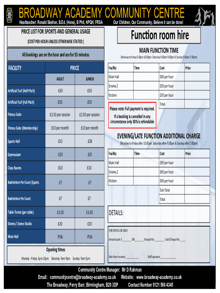 BROADWAY ACADEMY COMMUNITY Center Headteacher: Ronald Skeleton, B. Ed. (Hons), B Phil, MPH, Four Children, Our Community, Believe it can be done!PRICE LIST FOR SPORTS AND GENERAL USAGEFunction room