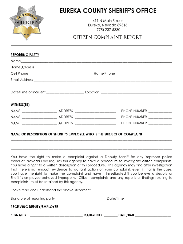 Get the free Eureka County Sheriff's Office Complaint Form