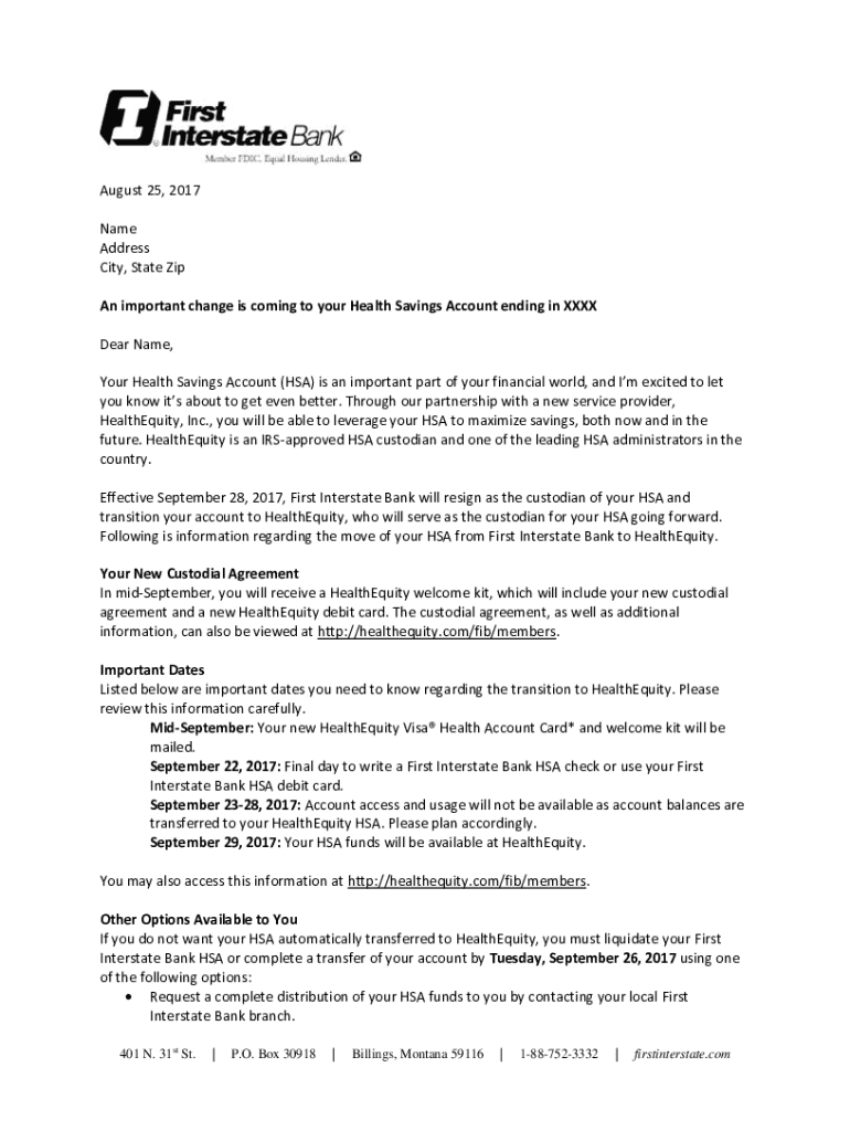 August 25, 2017, Name Address City, State Zip An important change is coming to your Health Savings Account ending in XXX Dear Name, Your Health Savings Account (HSA) is an important part of your financial
