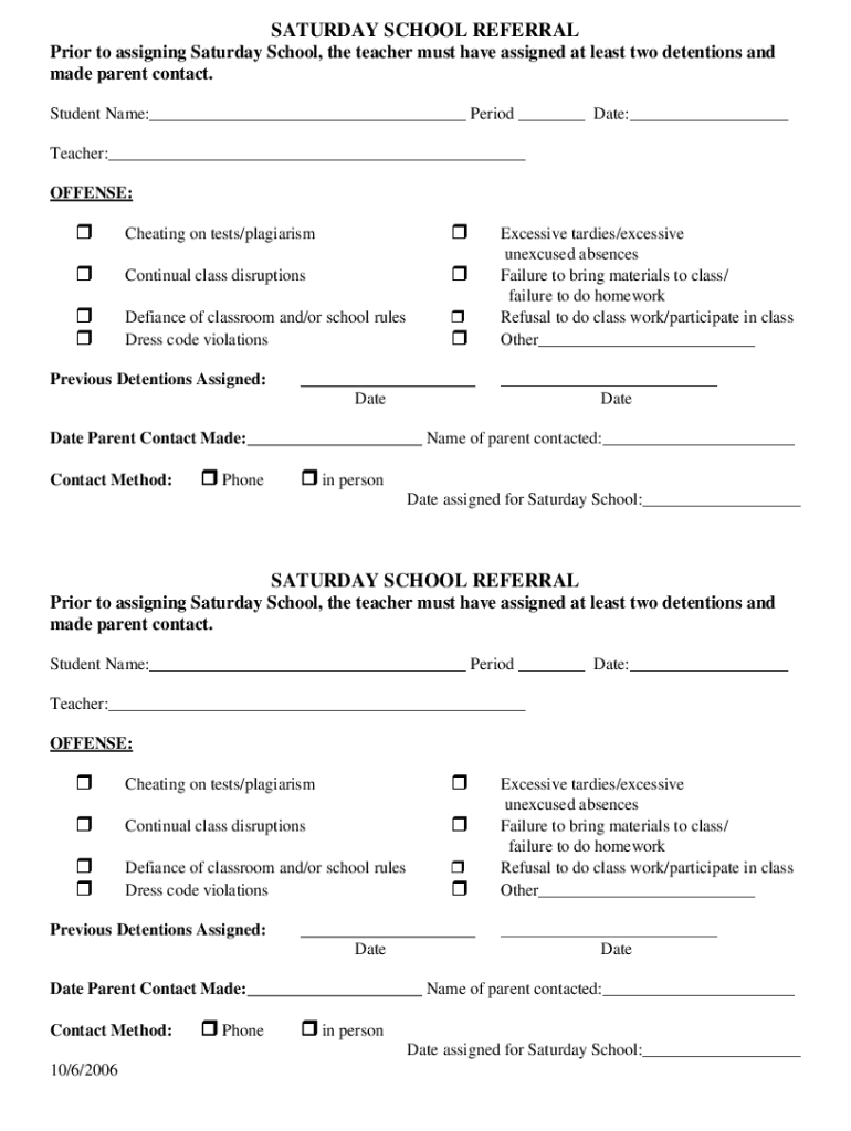 SATURDAY SCHOOL REFERRAL Prior to assigning Saturday School, the teacher must have assigned at least two detentions and made parent contact. Student Name:___ Period ___ Date:___ Teacher:___ OFFENSE:Cheating