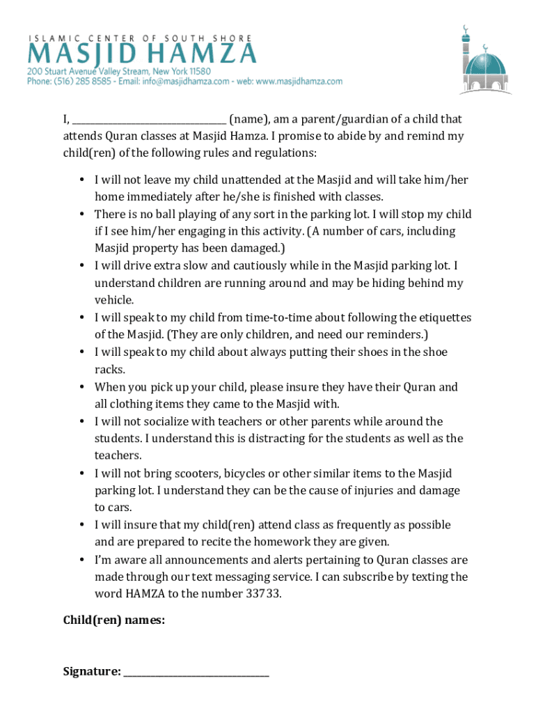 I, ___ (name), am a parent/guardian of a child that attends Quran classes at Masjid Hamza. I promise to abide by and remind my child(men) of the following rules and regulations: I will not leave my